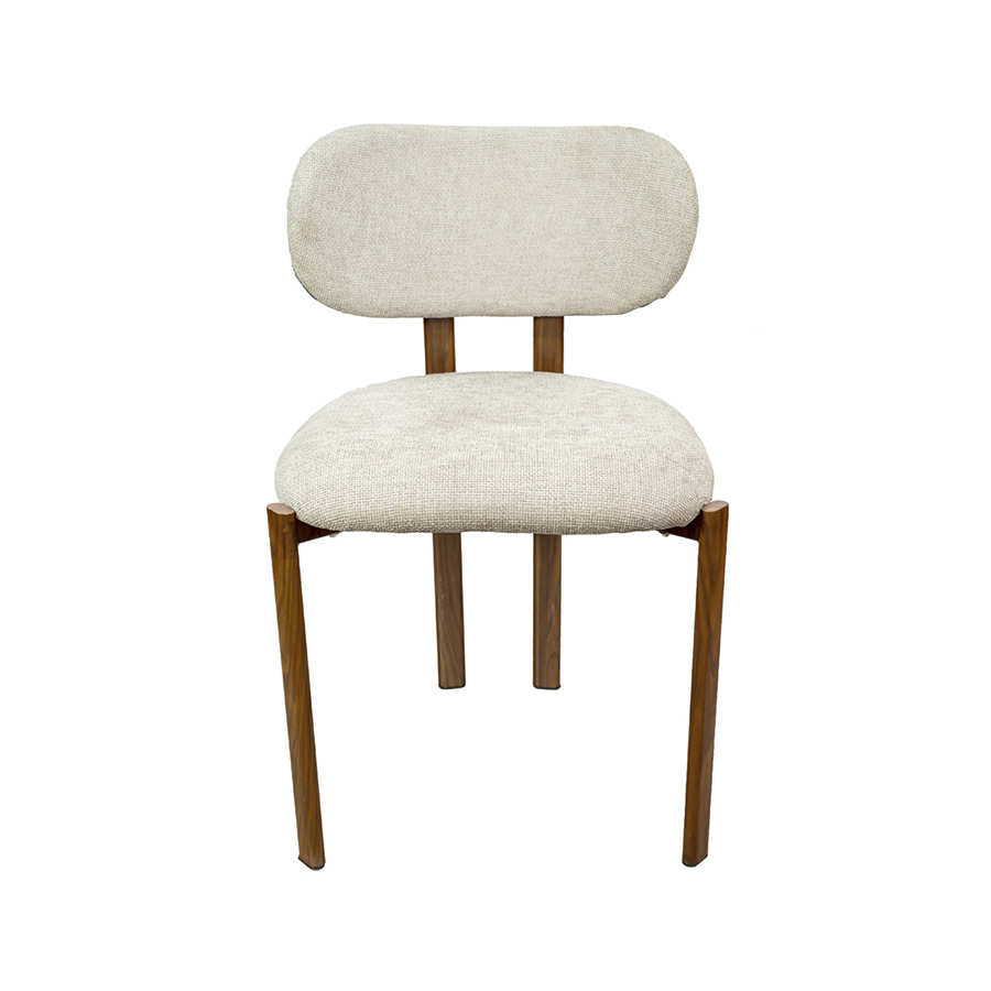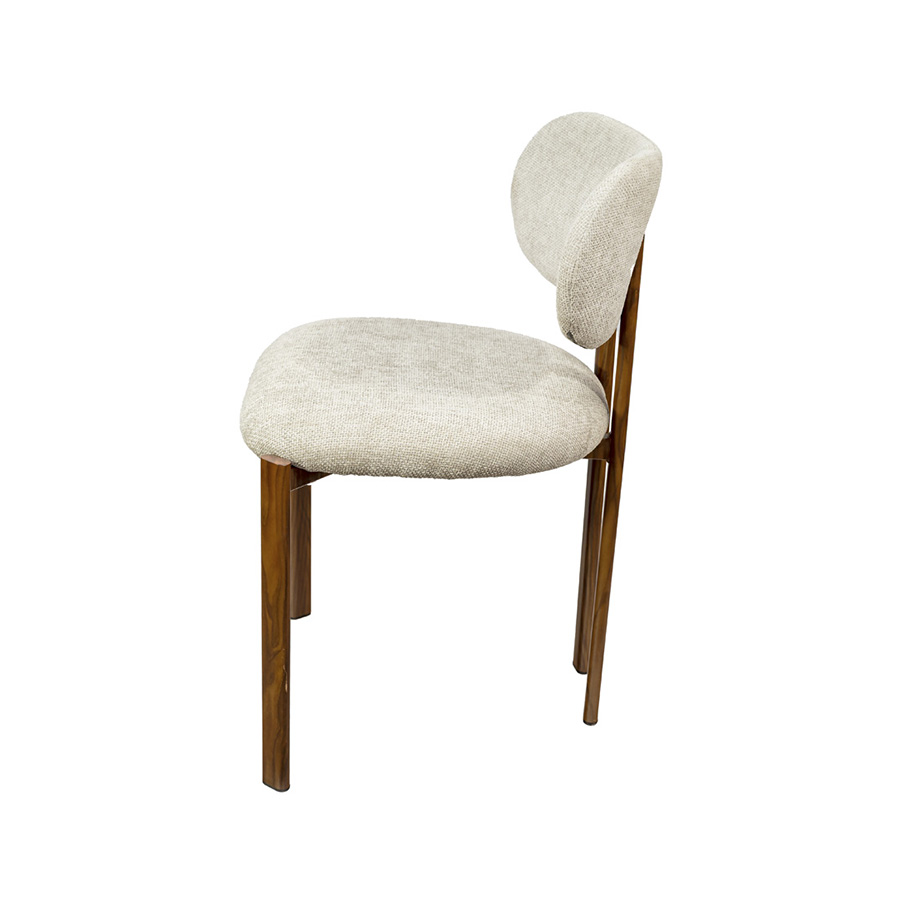 Assento e encosto em espuma revestida com linho e estrutura metálica simulando madeira.