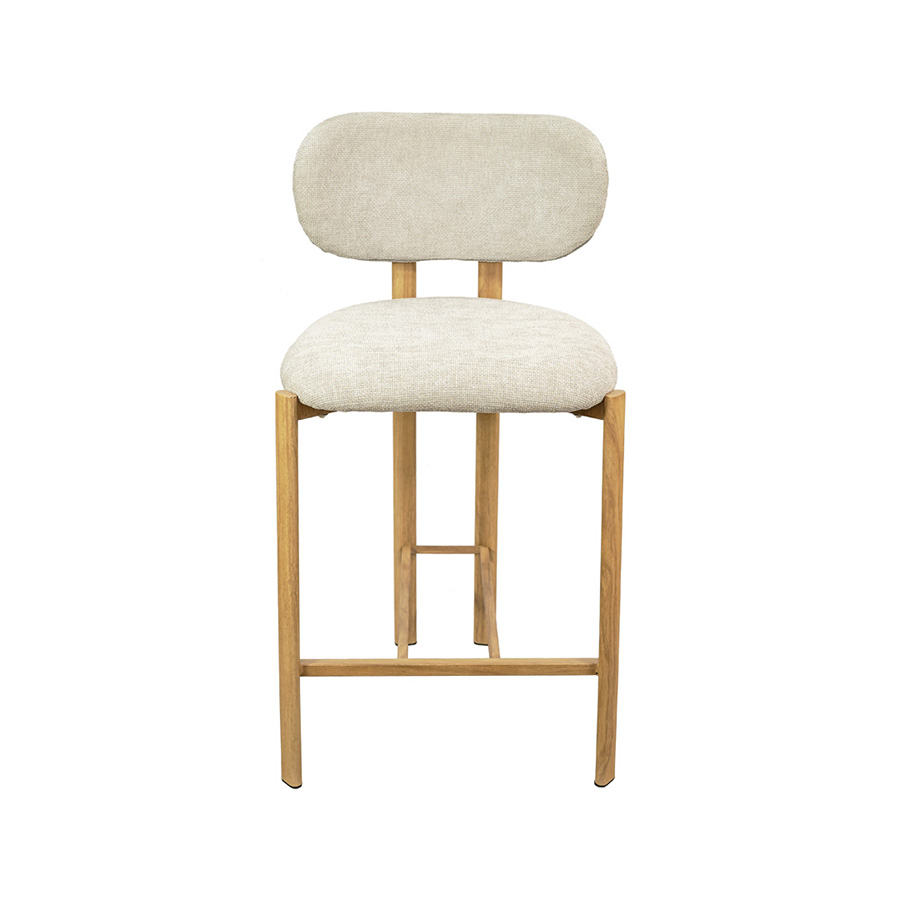 Assento e encosto em espuma revestida com linho e estrutura metálica simulando madeira clara.