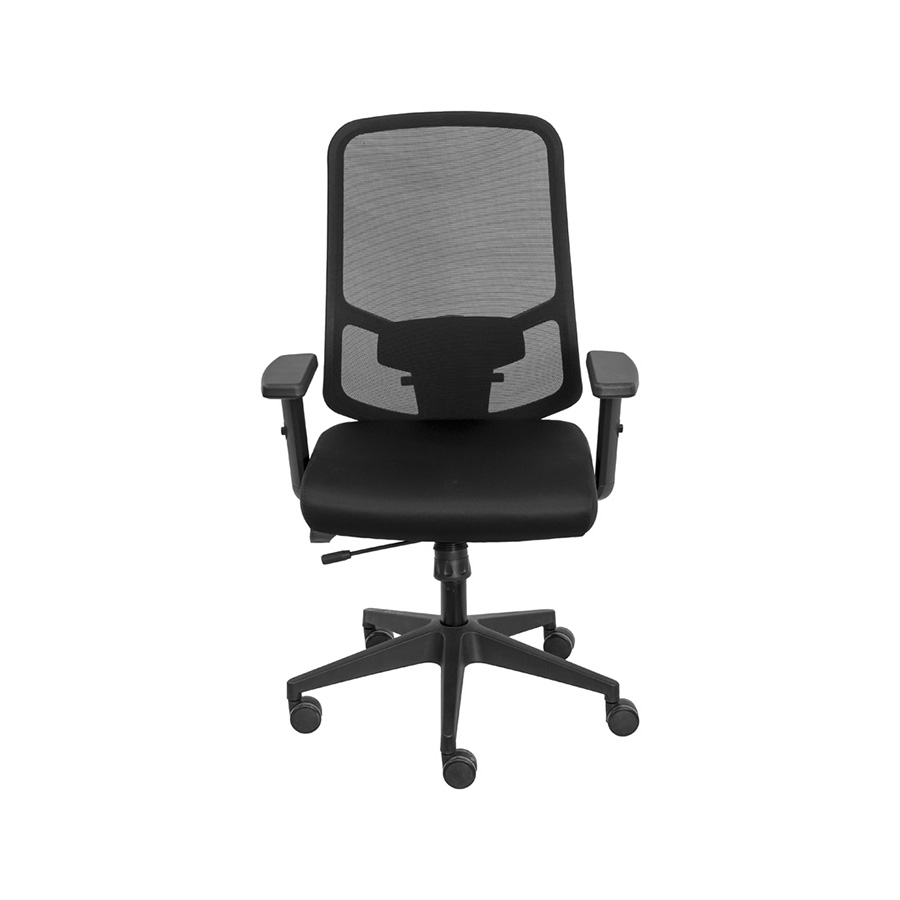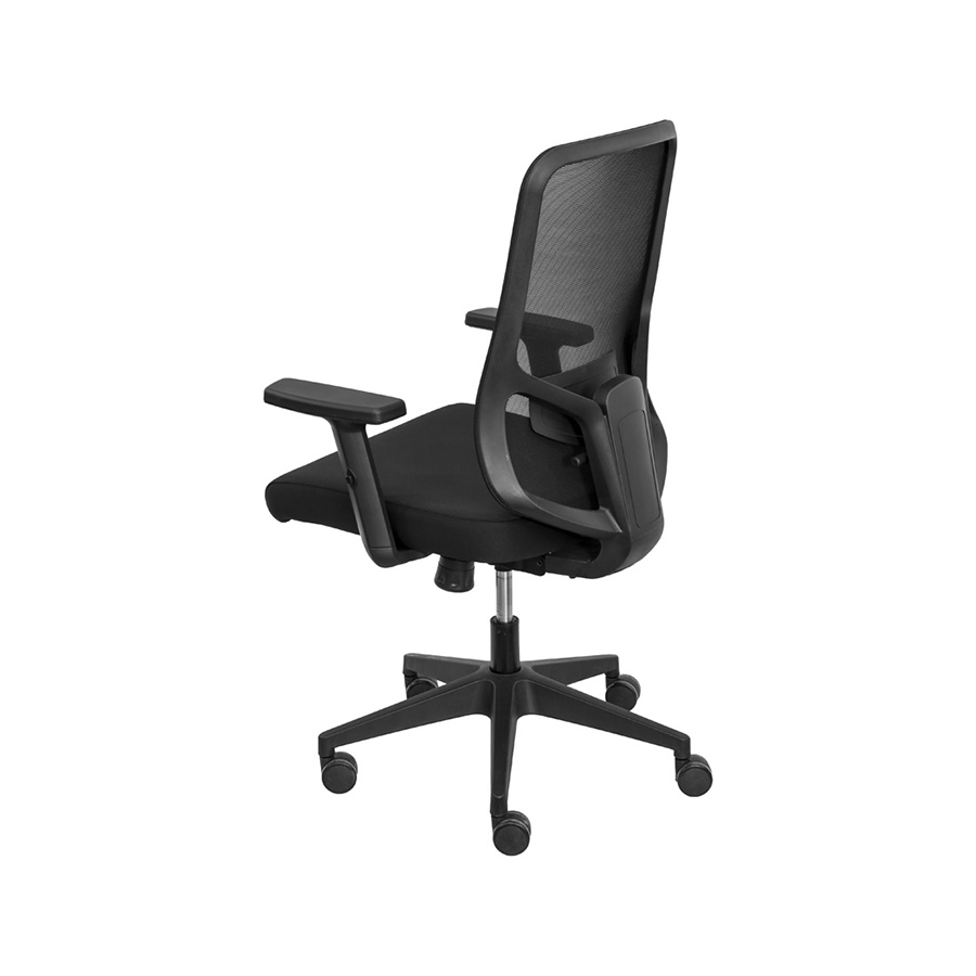 Assento em espuma injetada, encosto em tela com apoio lombar, ajuste de braços, ajuste de altura, com Sistema Relax, Sistema Syncron e Sistema Slide.