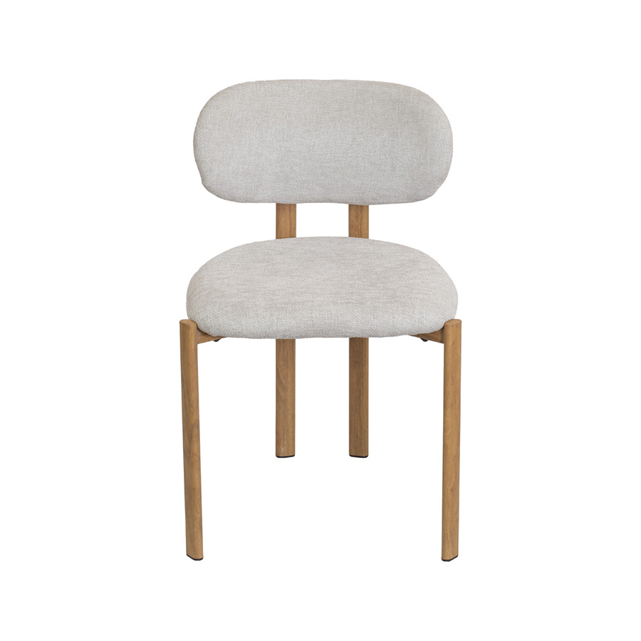 Assento e encosto em espuma revestida com linho e estrutura metálica simulando madeira.